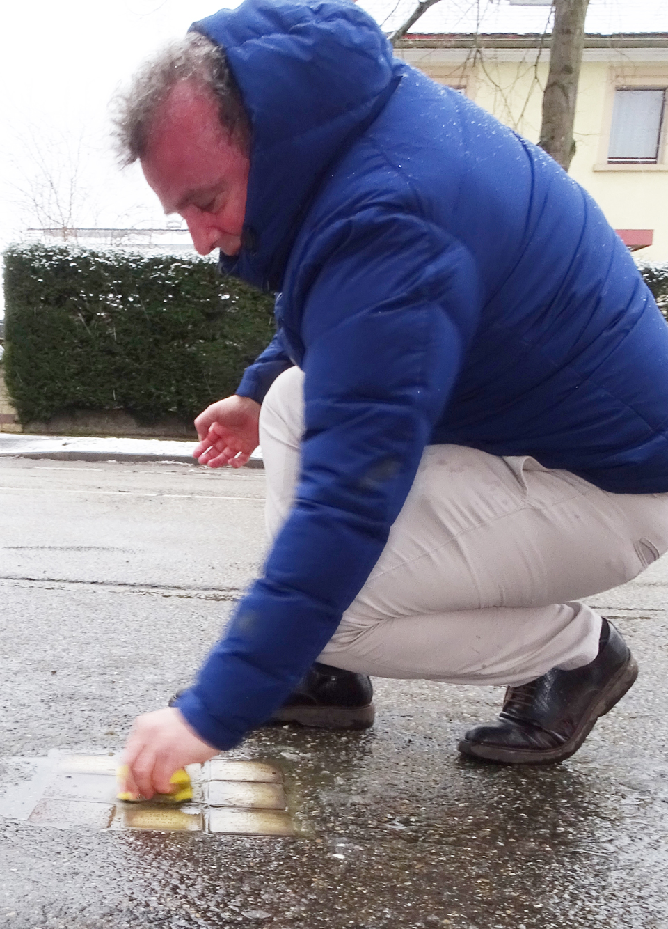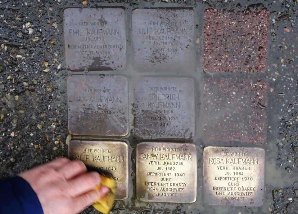 Beim anschließenden Rundgang „Auf den Spuren der Stolpersteine“ wurde auf die Lebensgeschichten der betroffenen Familien eingegangen mit einer gleichzeitigen Putzaktion der Stolpersteine.