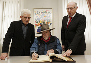 In Kuppenheim legt ihm Bürgermeister-Stellvertreter Rudolf Jörger (rechts) das Ehrenbuch der Stadt vor.